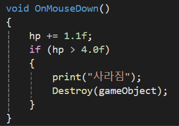 - 만약 obj가 GameObject라면 GameObject와 GameObject의 컴포넌트와 자식들도 파괴한다. 실제 오브젝트 파괴는 항상 업데이트 루프 뒤로 밀린다. 하지만 항상 렌더링 전에 완료된다.