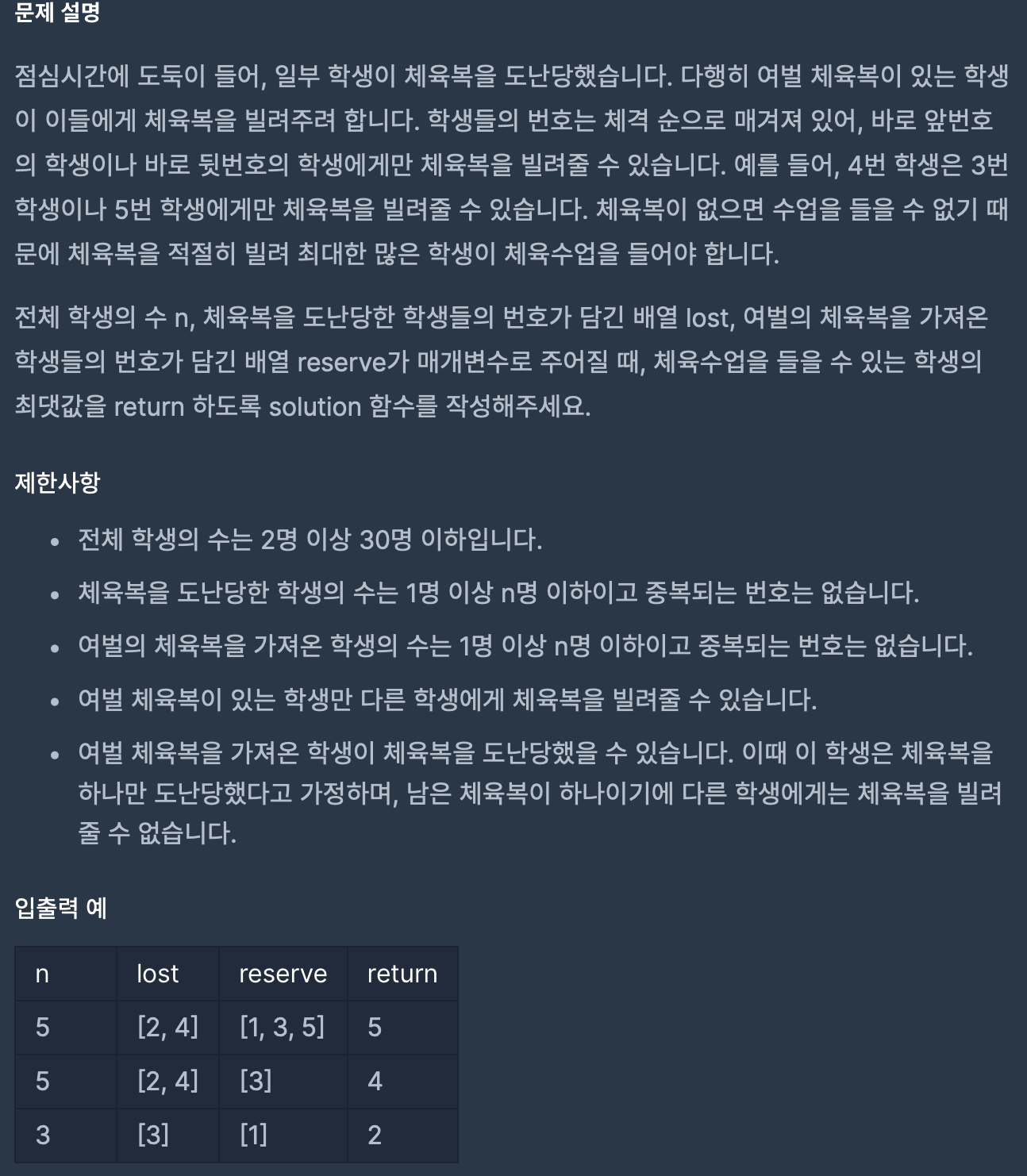 학생들이 가진 체육복 수를 적어놓은 배열을 만들자. (1번 학생 -> 0번 인덱스, 2번 학생 -> 1번 인덱스, 3번 학생 -> 2번 인덱스, ...)