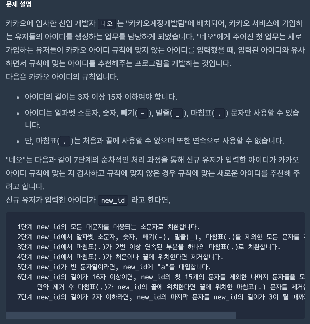 // 만약 제거 후 마침표(.)가 new_id의 끝에 위치한다면 끝에 위치한 마침표(.) 문자를 제거합니다.