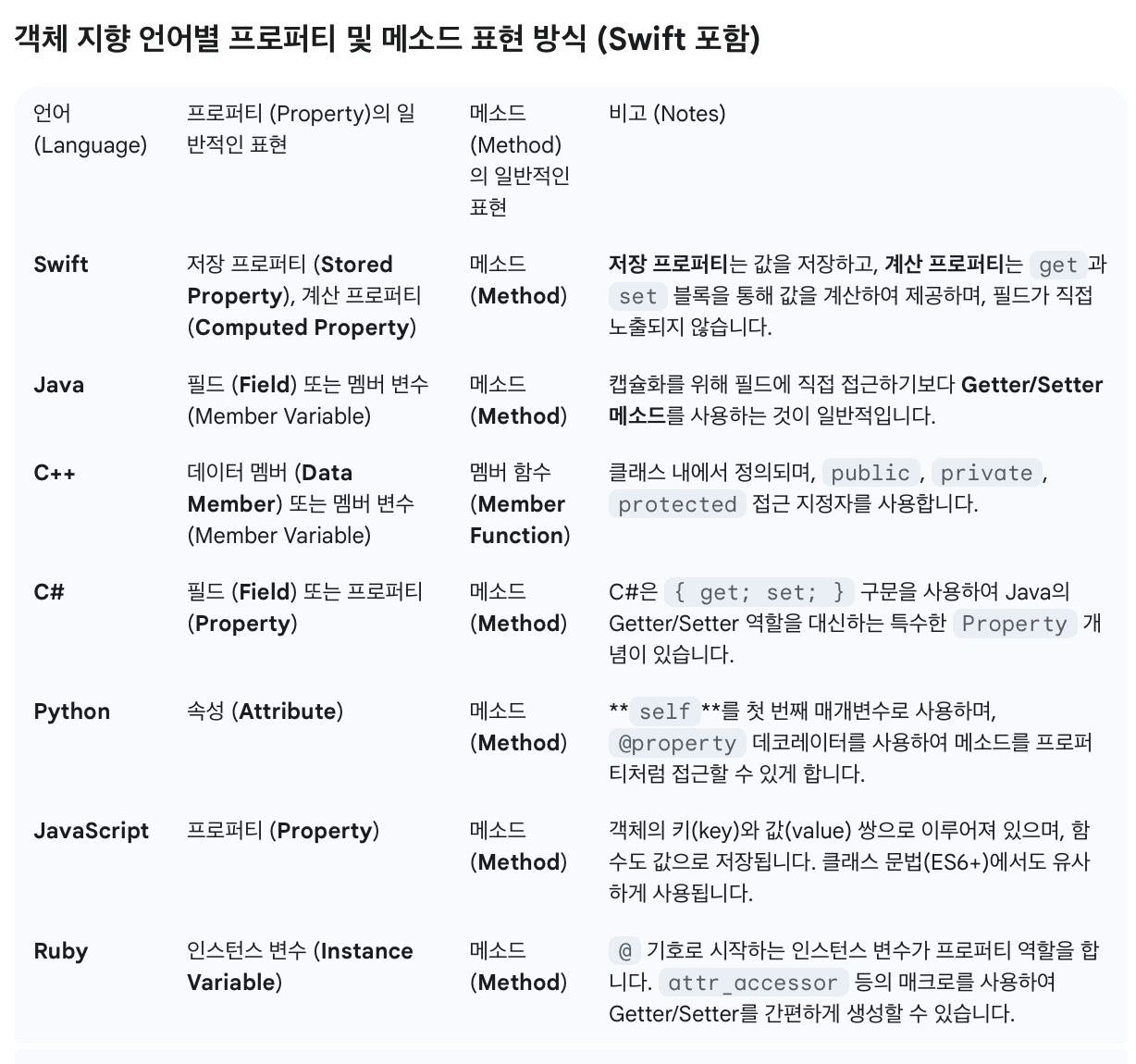 - 일반적으로 프로퍼티를 지칭하면 stored property를 지칭한다.