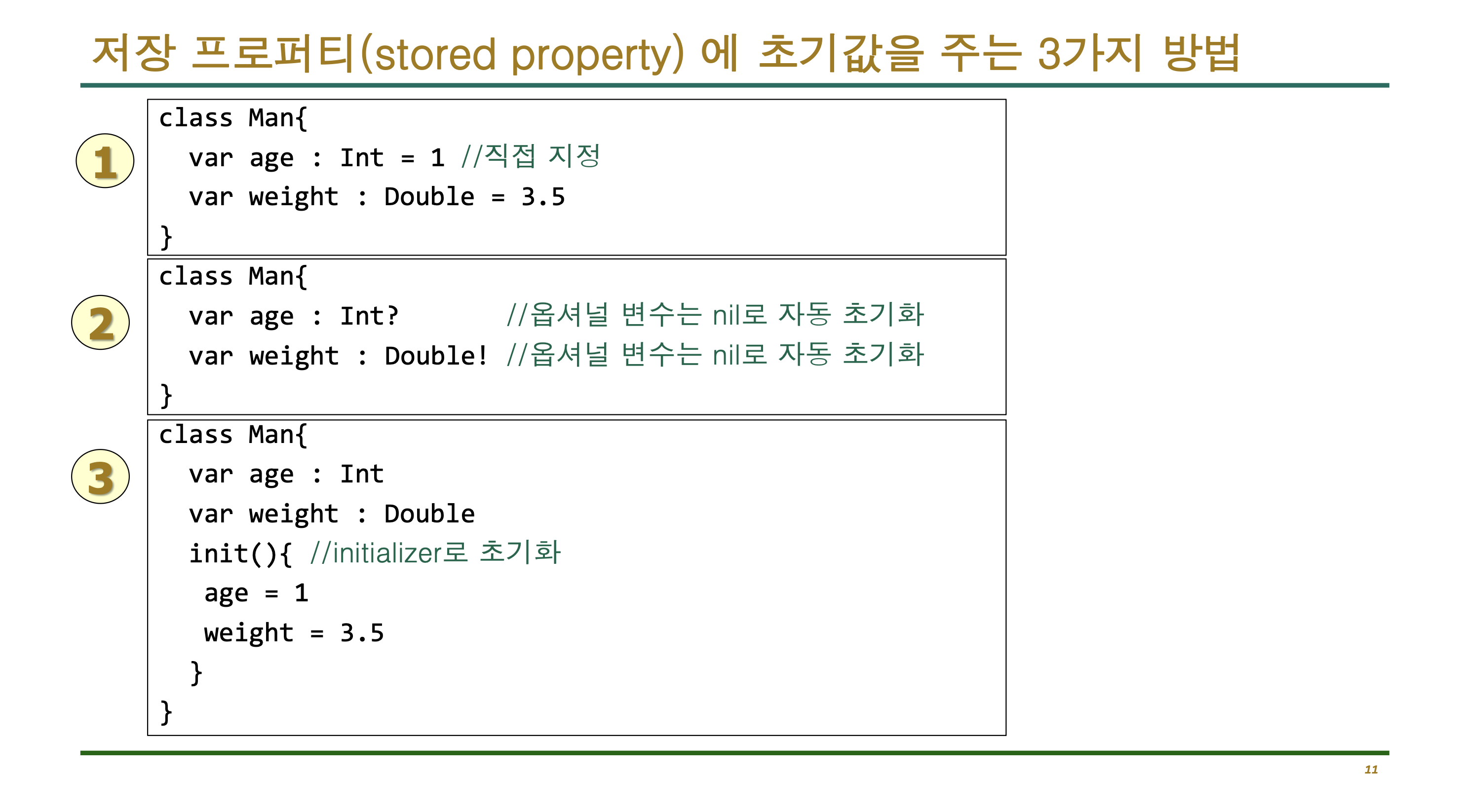 - 스토어드 프로퍼티는 반드시 초기값이 있어야 하는데, 3가지 방법 중 3번이 가장 일반적.